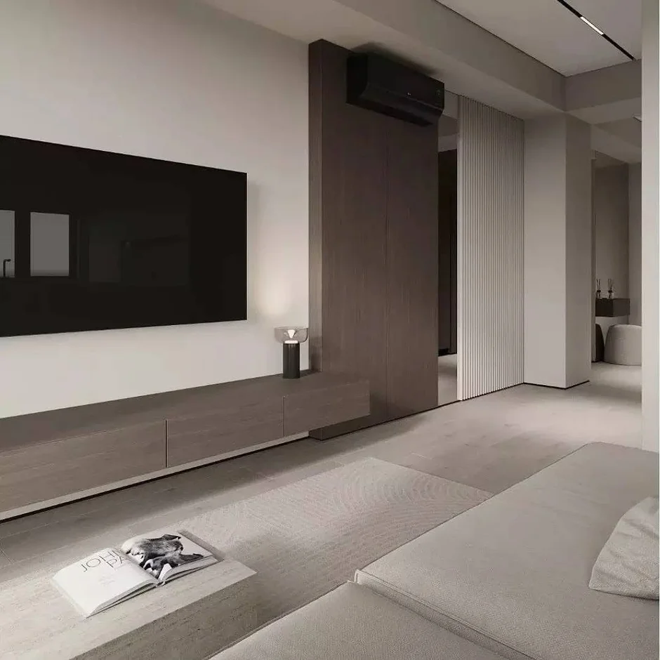 Completed a modern living area with a wall-mounted TV, custom-built media unit, and clean architectural lines to maintain a calm and uncluttered appearance. -