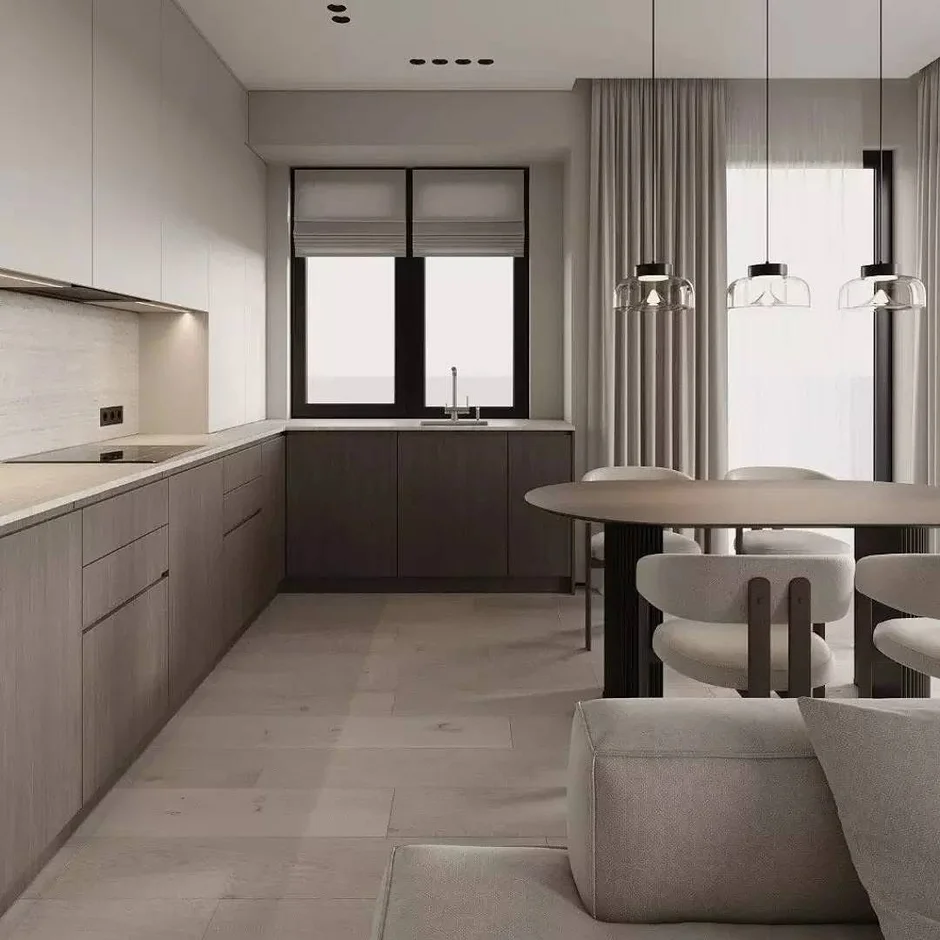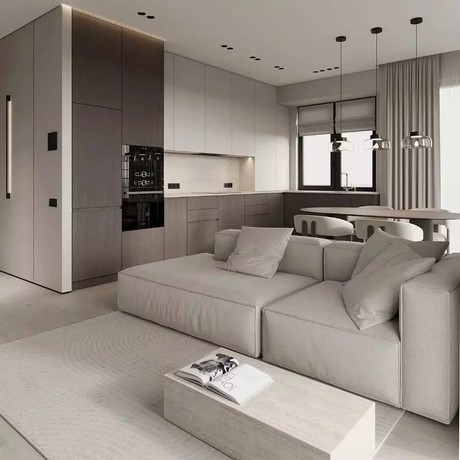 This project showcases a complete renovation of an open-plan kitchen and living area designed in a modern minimalist style. The interior focuses on clean lines, neutral tones, and a balanced combination of matte finishes, natural textures, and integrated lighting to create a refined and functional living space.