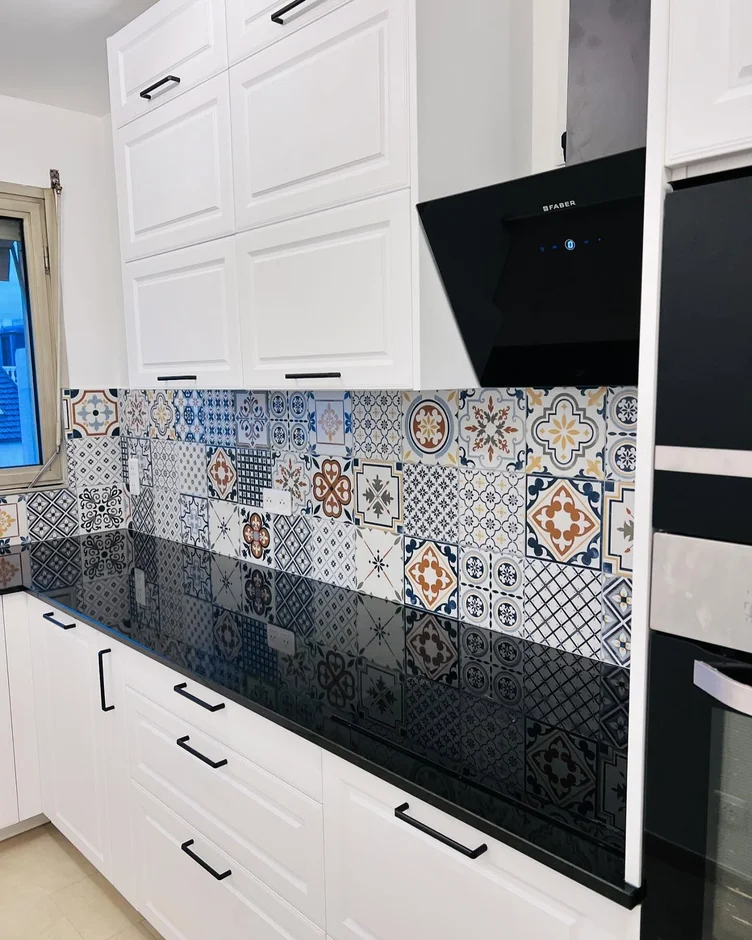 Integrated glossy black worktops that complement the patterned tile while ensuring durability and easy maintenance. Their reflective surface enhances brightness and depth. -