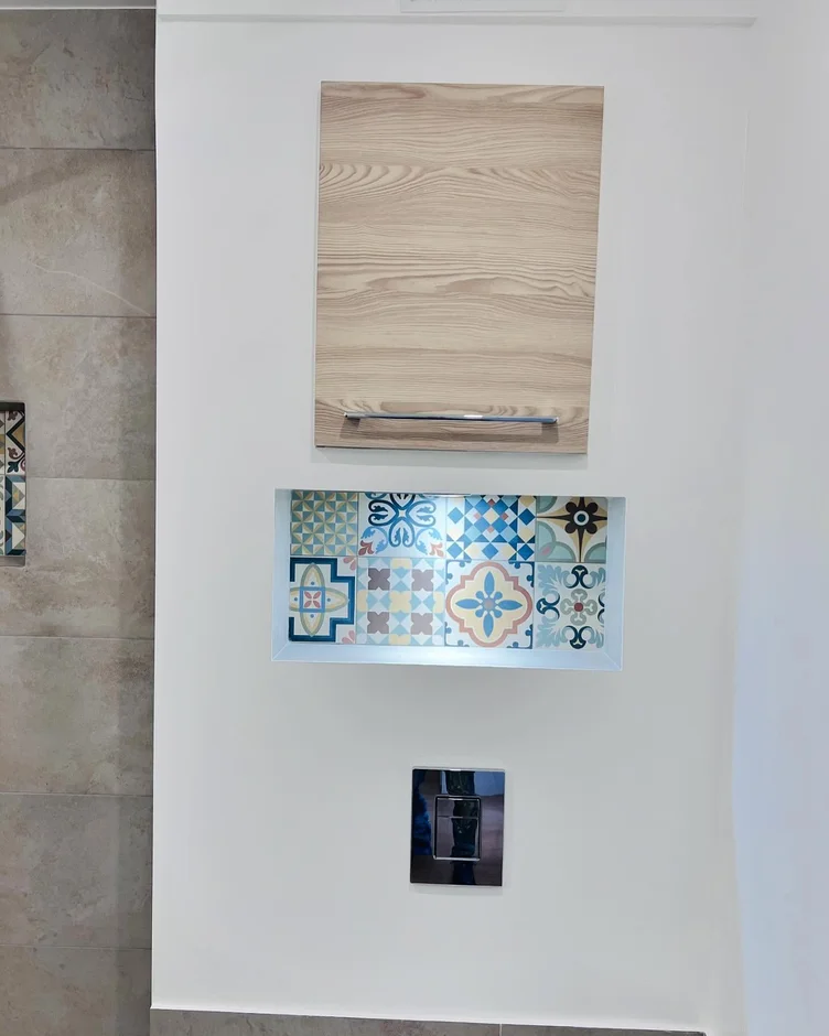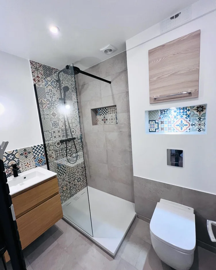 Added recessed wall niches inside the shower and above the toilet, finished with patterned tiles to offer both practicality and cohesive visual rhythm. -