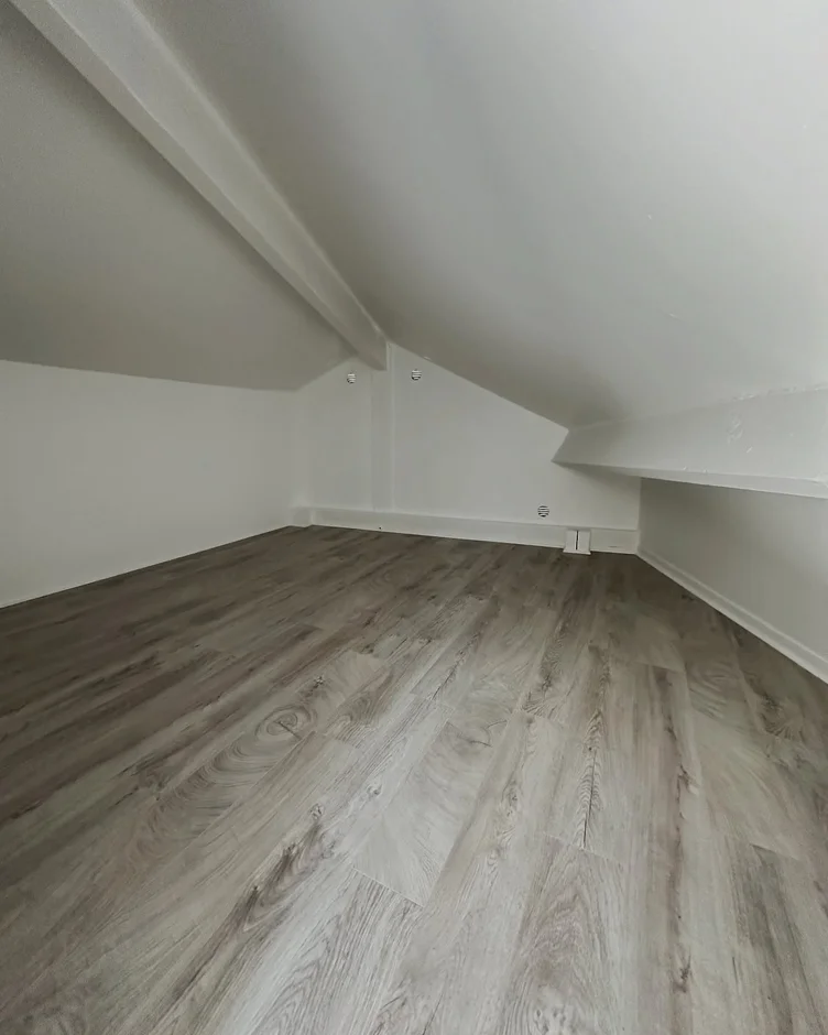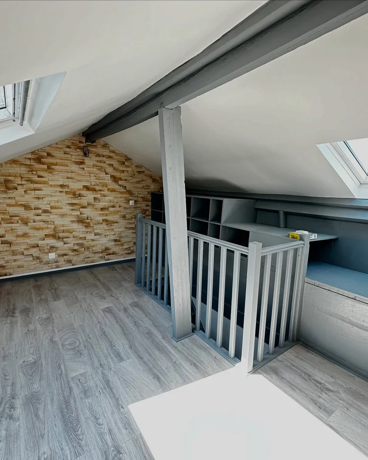 Repainted structural beams in a modern grey tone, preserving the attic’s architectural charm while giving it a clean, cohesive look. -