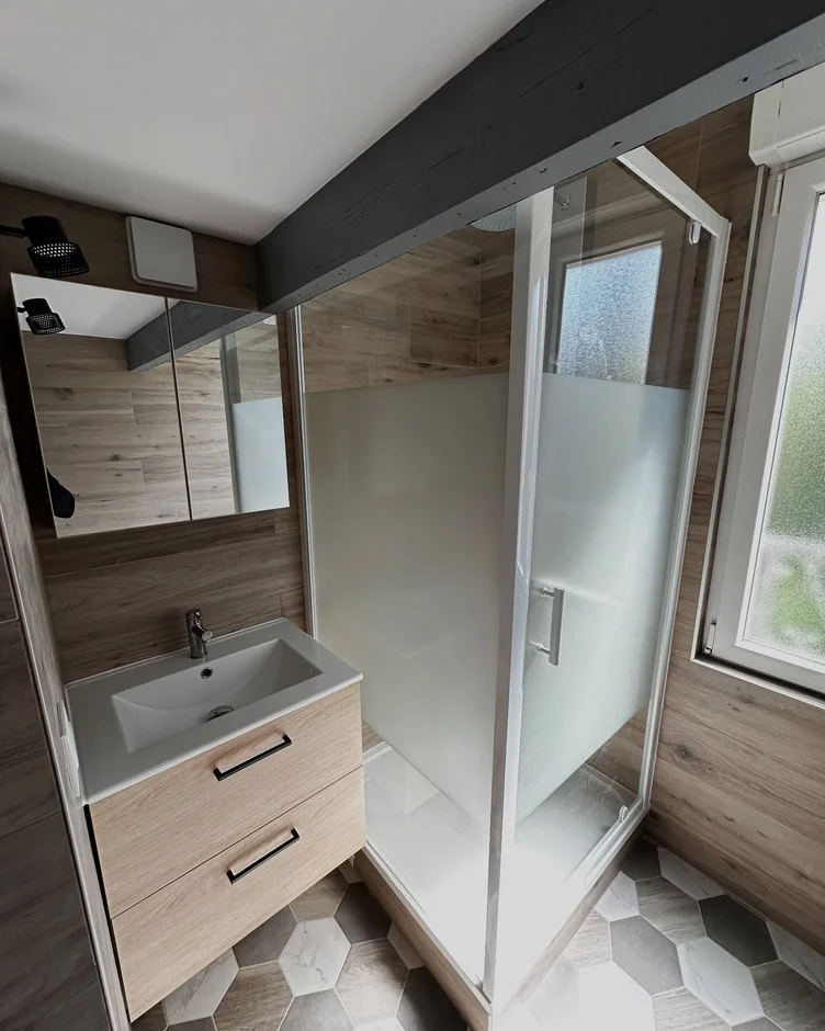 Replaced the existing unit with a bright shower cabin featuring a partially frosted glass panel and a slim-profile tray. The modern chrome fixtures complement the bathroom's material palette. -