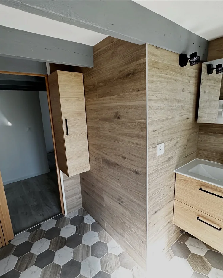 This renovation transforms a compact attic apartment into a warm, contemporary living space with a strong focus on natural textures, soft tonal contrasts, and optimized spatial ergonomics. The project combines wood-inspired finishes, geometric flooring, clean-lined cabinetry, and exposed structural beams repainted for a fresh architectural character.