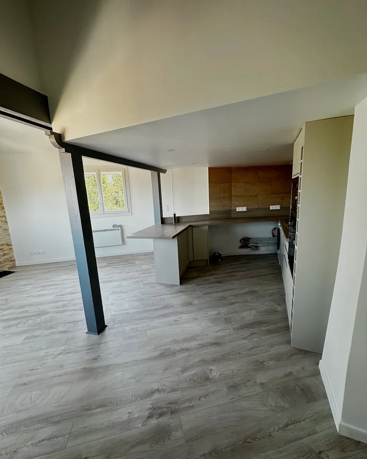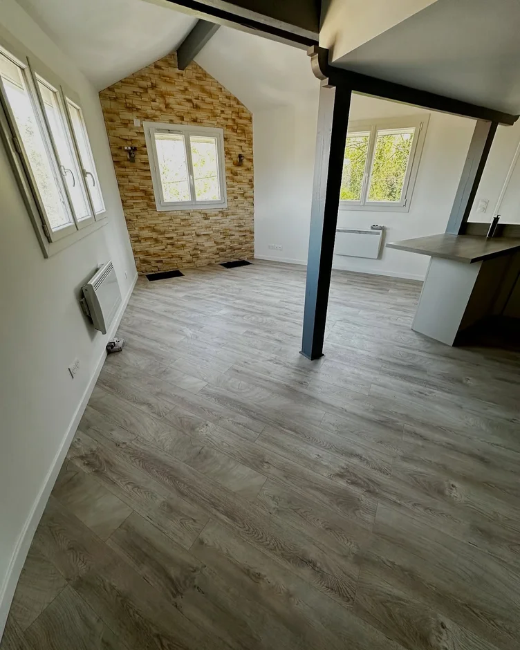 Created an open-plan living space with new grey-toned wood flooring. The refreshed color palette enhances natural light and unifies the various functional zones. -