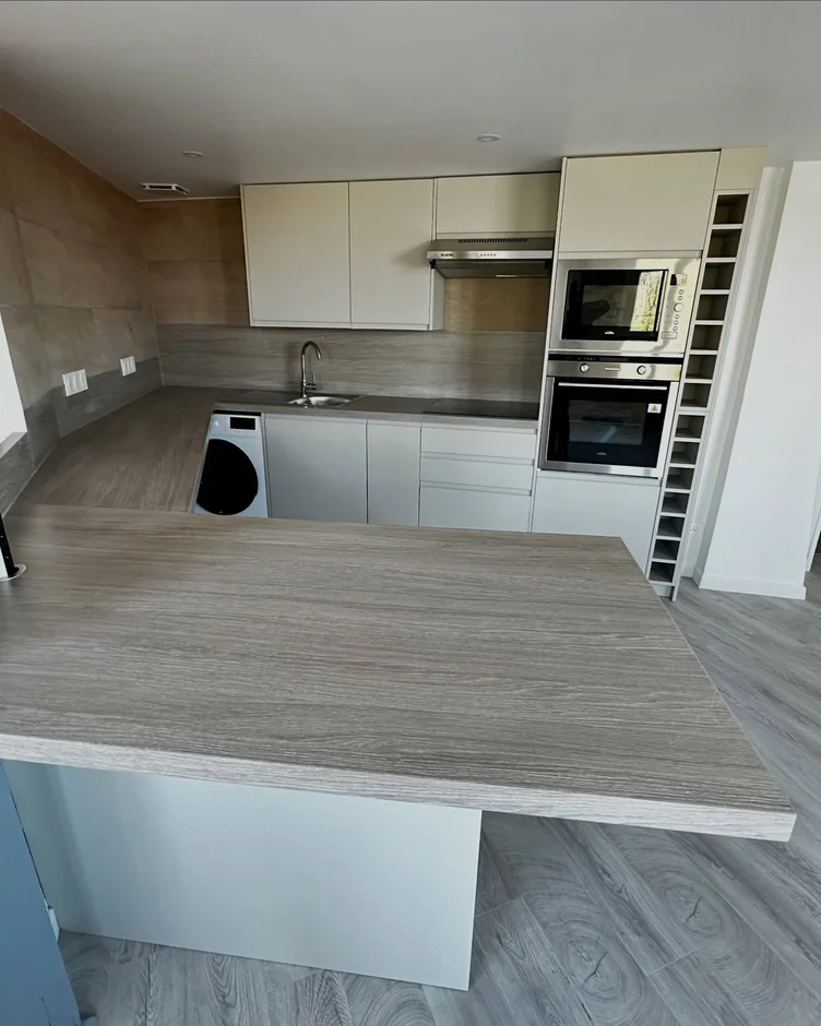 Designed a compact, highly functional kitchen with soft matte cabinetry, wood-look countertops, and integrated appliances. The neutral tones blend seamlessly into the open living area. -