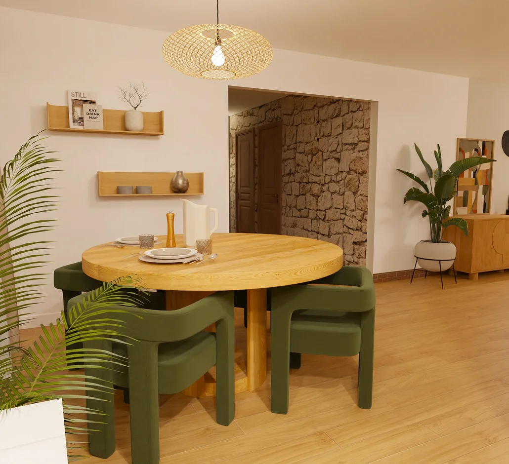 Installed a round wooden dining table paired with green upholstered chairs. This setup enhances social interaction and brings harmony through its natural material palette. -