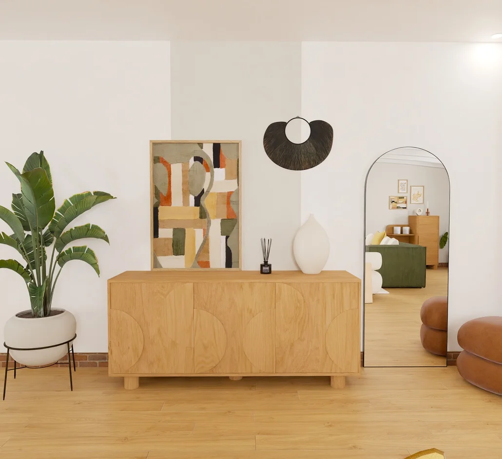 Added modern storage units, floating shelves, and accent cabinets to keep the space organized while showcasing decorative elements. The wood finishes enhance the cohesive natural palette.