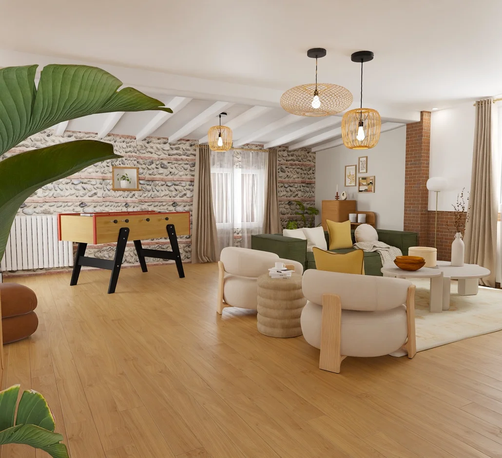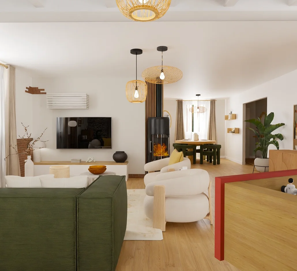 This renovation transforms the living and dining area into a warm, inviting, and nature-inspired open-concept space. Soft earthy tones, natural wood textures, sculptural furniture, and thoughtfully layered lighting create a harmonious environment that feels both modern and deeply comfortable. With a focus on organic shapes, subtle contrasts, and functional zoning, the design embodies a cozy yet refined aesthetic.