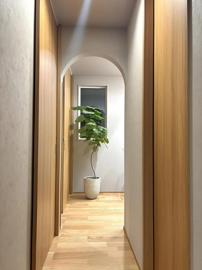 A harmonious combination of natural oak flooring, wood veneer elements, stone-textured surfaces, and neutral plastered walls establishes a timeless, earthy aesthetic. -