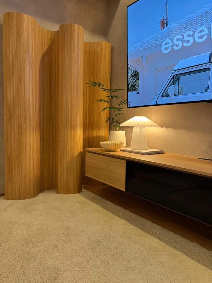 Bespoke wood details—including vertical slatted partitions, floating cabinetry, and integrated shelving—add texture and craftsmanship throughout the interior. -