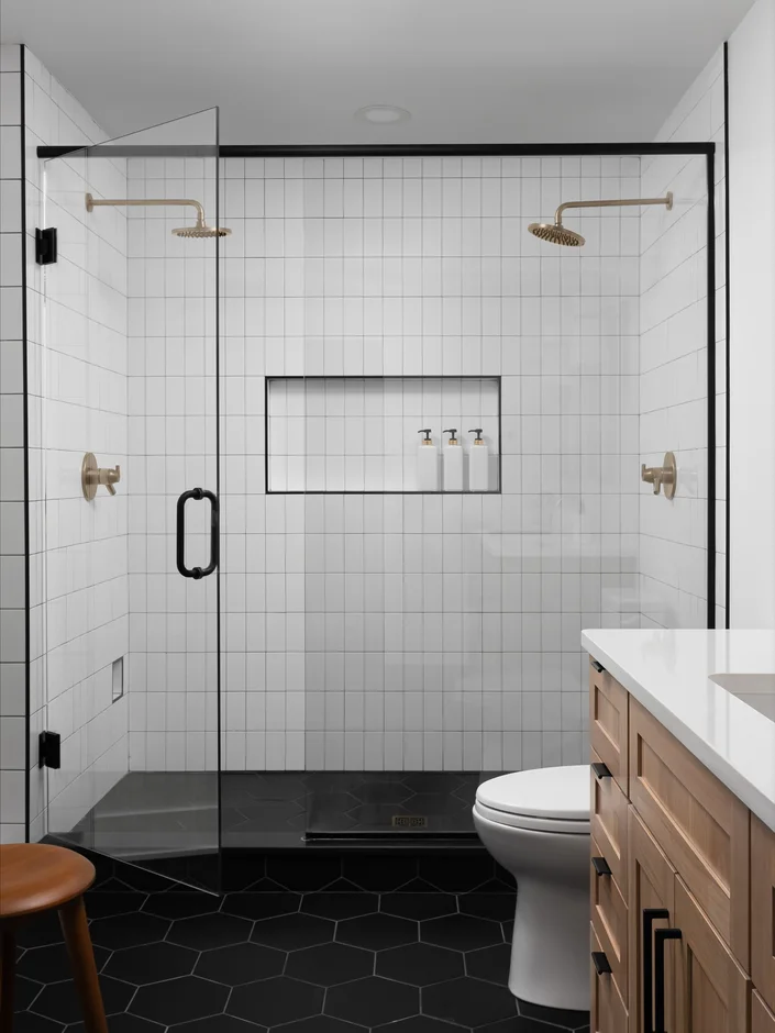 Applied a combination of white wall tiles and contrasting dark hexagon floor tiles to create visual depth and clear zoning. Precise alignment and clean grout lines ensure a crisp, high-end finish throughout wet areas. -