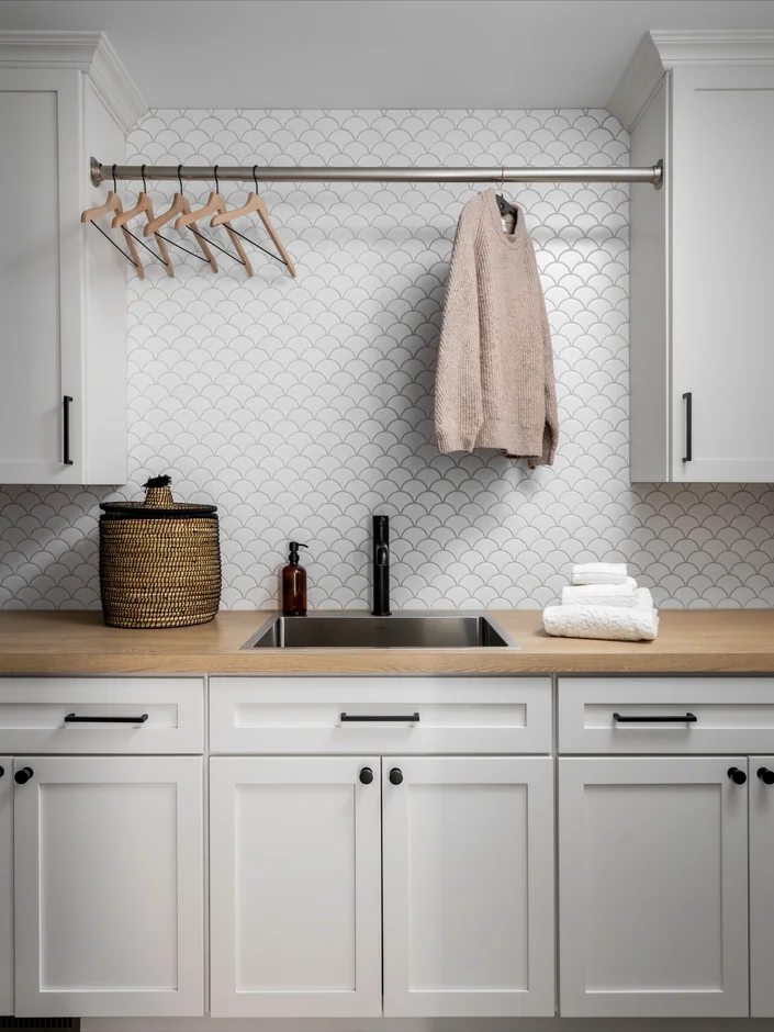 Designed and installed bespoke cabinetry in light natural wood tones for bathrooms, laundry, and kitchen areas. Shaker-style fronts, integrated storage solutions, and matte black hardware ensure durability, practicality, and a modern yet classic appearance. -