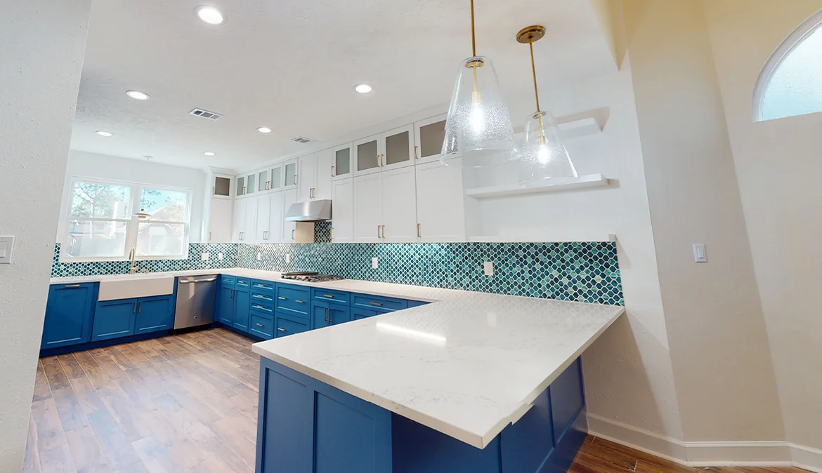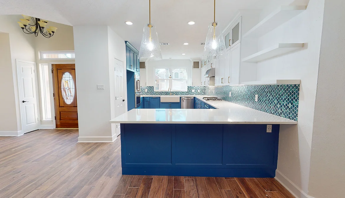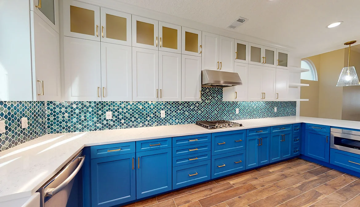 The finished kitchen is bold, bright, and highly functional. The contrast between blue cabinetry, white surfaces, and textured tile creates a dynamic yet timeless design. Custom finishes and thoughtful layout improvements ensure the space works just as beautifully as it looks.