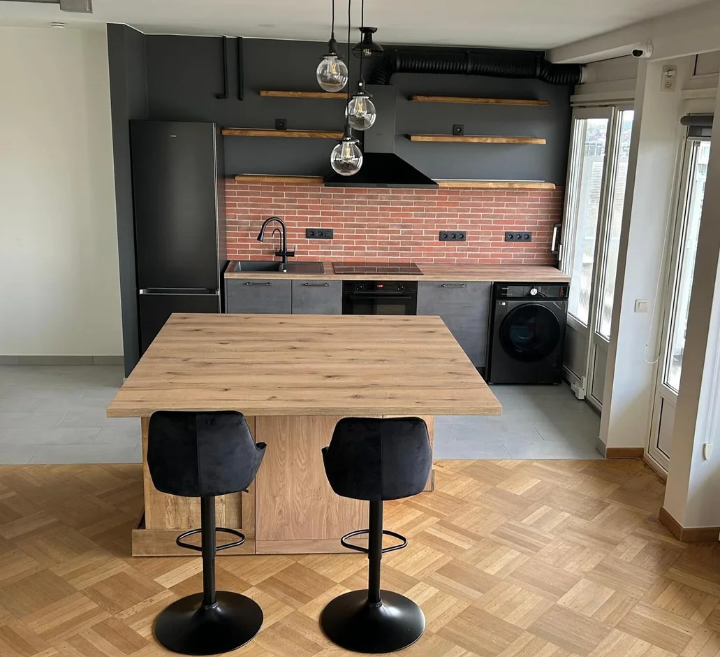 This industrial-style kitchen renovation blends raw textures, modern functionality, and warm wood accents to create a bold yet inviting cooking space. The combination of matte finishes, brick details, and open shelving gives the interior a stylish loft-inspired character.