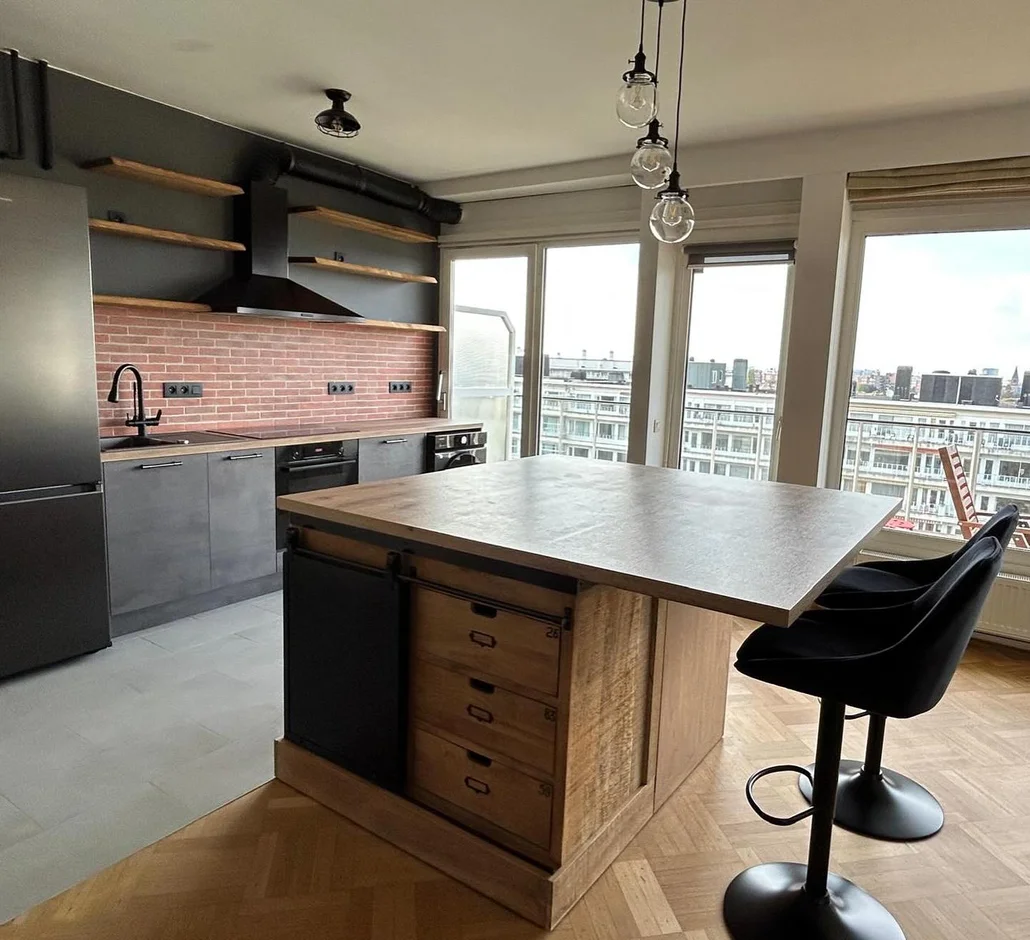 Designed a red brick backsplash for authentic loft vibes, adding texture and depth while maintaining a raw industrial feel. -