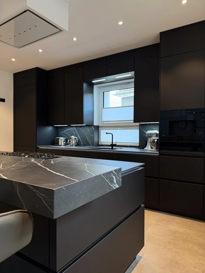 Installed a custom matte-black island with an oversized porcelain countertop featuring expressive white veining. The extended slab edge creates a sculptural, floating effect and provides generous working and seating space. -
