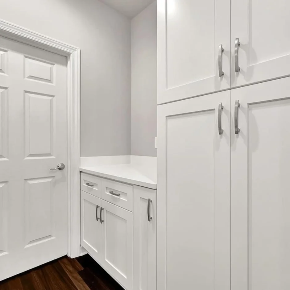 Installed full-height white shaker-style cabinets with crown molding, maximizing storage while maintaining a clean and elegant appearance. -