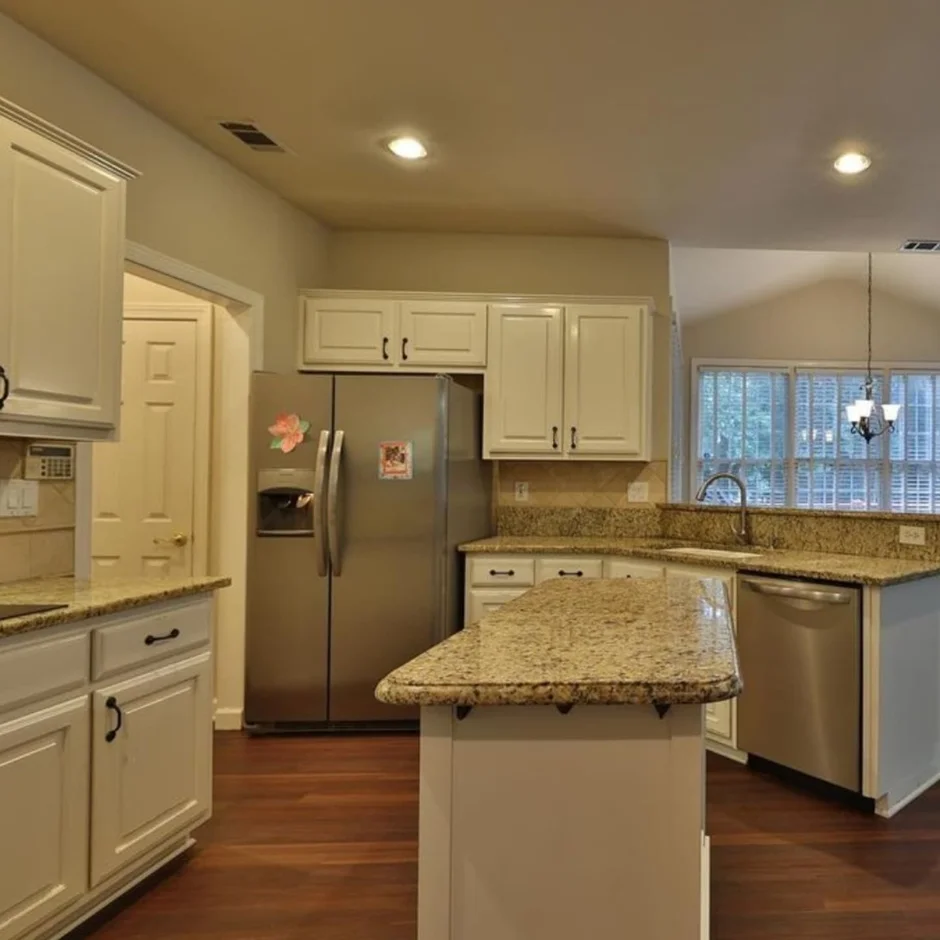 Installed recessed ceiling lights and modern pendant fixtures above the island to ensure even illumination and enhance the kitchen’s functionality. -