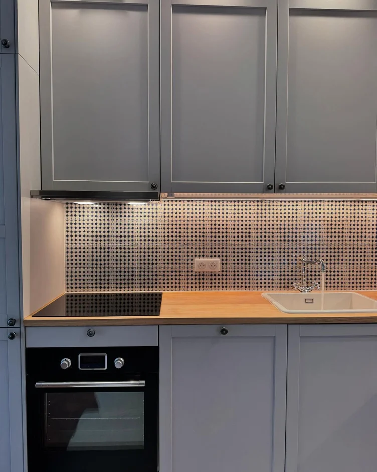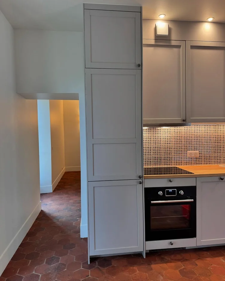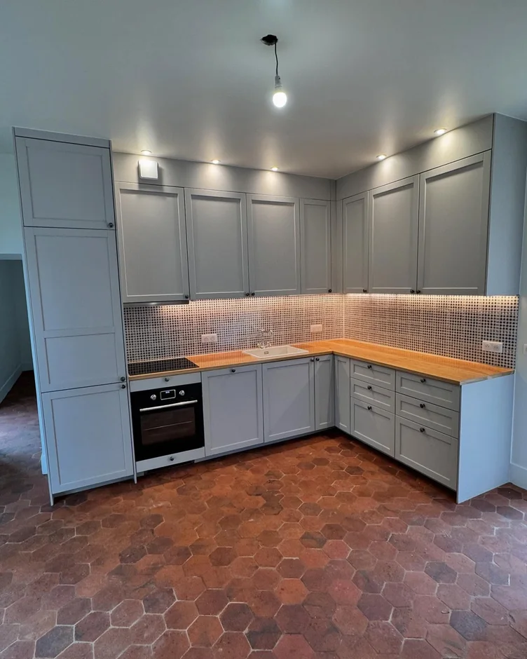 This renovation transforms a compact kitchen into a warm, functional space that blends traditional cabinetry with natural wood textures and patterned tile detailing. Soft grey fronts, a solid wood worktop, and authentic terracotta flooring create a harmonious balance between modern comfort and classic charm.