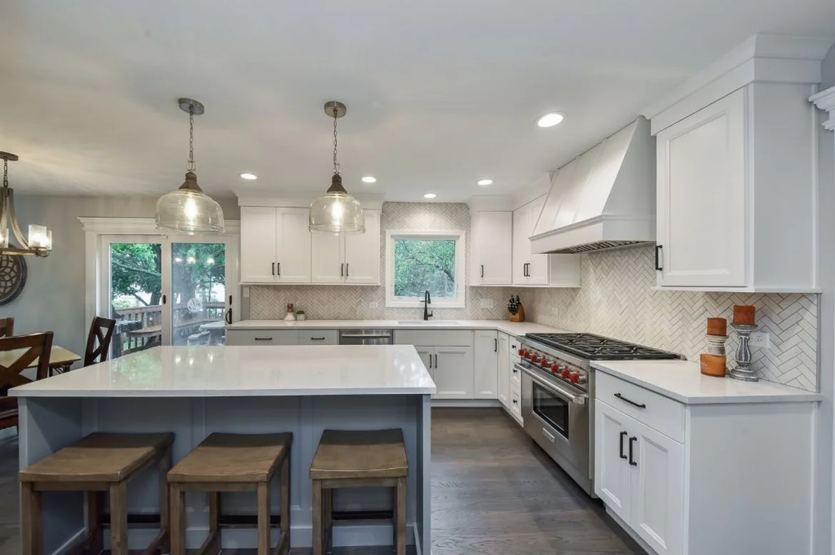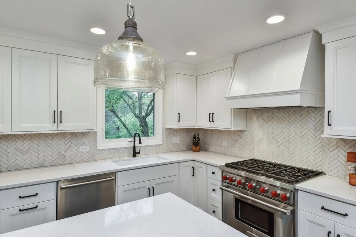 Upgraded All Surfaces: High-performance white quartz countertops and a herringbone backsplash for texture and elegance.