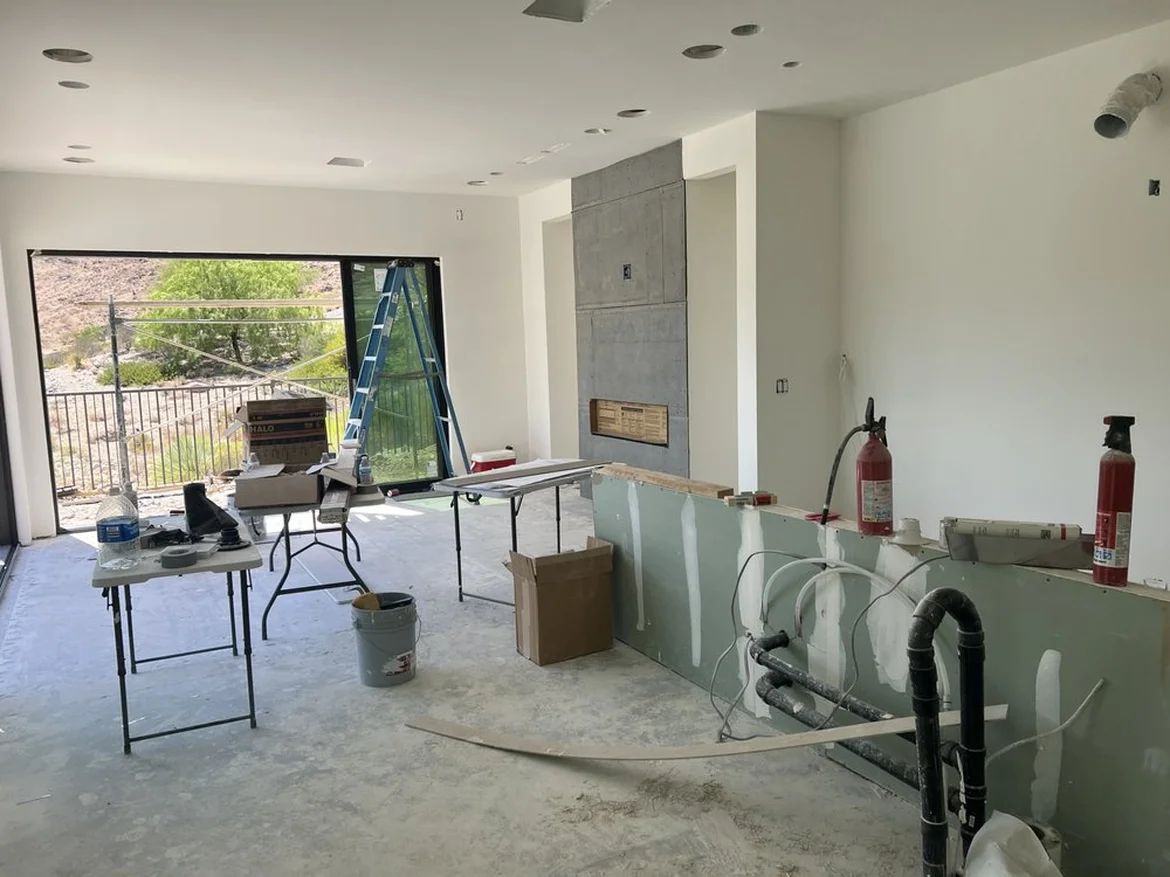 The kitchen space was built out from an unfinished condition. Framing and structural supports were installed for the kitchen island, base cabinets, and integrated appliances.