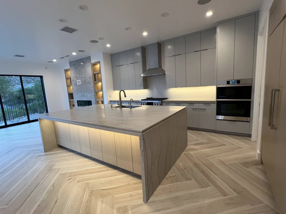 New flooring in a herringbone pattern was installed throughout the kitchen area, providing durability and a finished modern appearance.