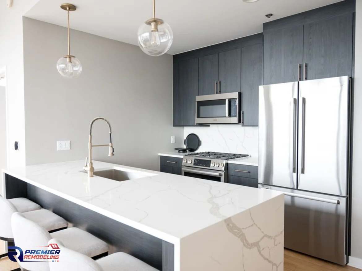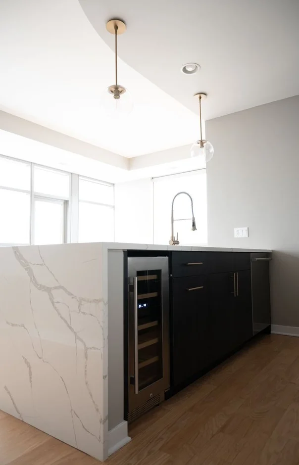 Premium marble-veined quartz countertops were installed throughout the kitchen, including a large center island with waterfall edges. These surfaces offer durability, low maintenance, and a refined modern aesthetic.