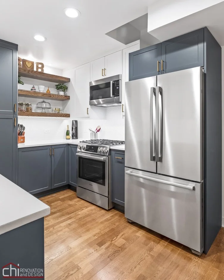 Existing cabinets were fully removed and replaced with custom shaker-style cabinetry in a two-tone finish. Soft-close drawers, brass hardware, and a full-height pantry cabinet provide increased storage, durability, and a refined contemporary look.