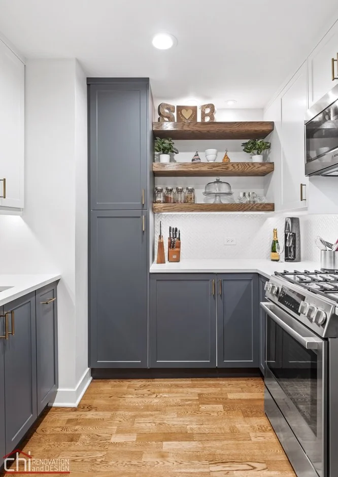 Custom wood floating shelves were installed within a built-in wall niche, creating functional open storage and decorative display space. These elements add warmth and visual depth while balancing the clean cabinet lines.