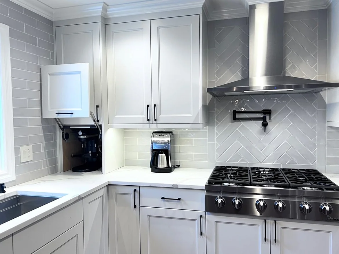 A full-height backsplash was installed using glossy gray subway tiles. Behind the cooktop, a herringbone tile pattern was added to create a stylish focal point while maintaining easy-to-clean surfaces.