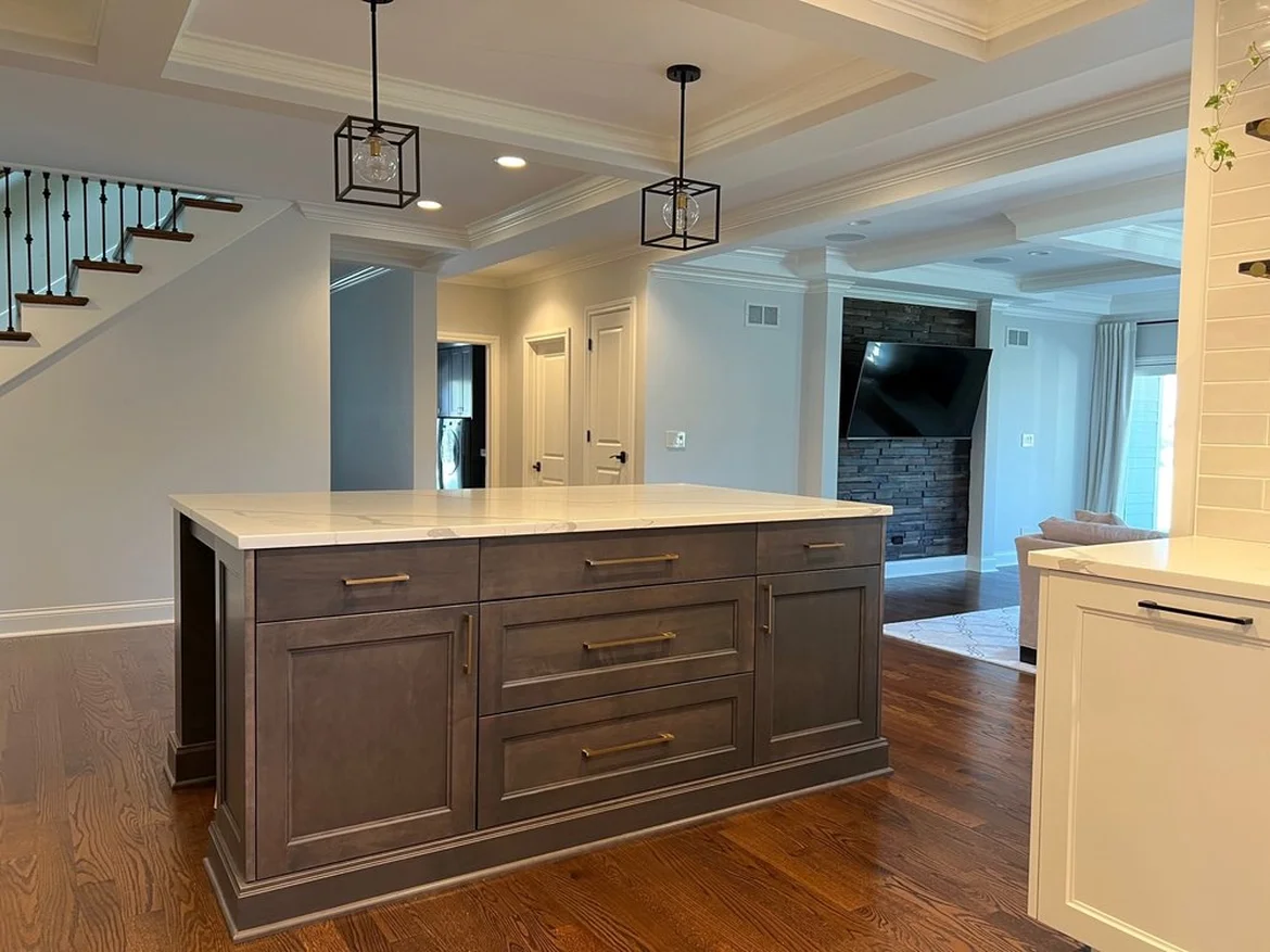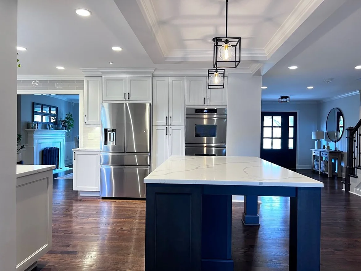 The electrical system was updated with new wiring, outlets, switches, and dedicated appliance circuits. A redesigned lighting layout includes recessed ceiling lights, pendant fixtures above the island, under-cabinet LED lighting, and updated dimmable controls for improved ambiance and visibility.