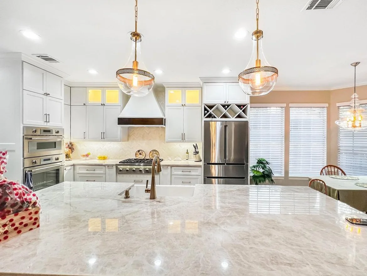 Worn countertops were replaced with premium marble-look quartz, creating a seamless, durable, and visually stunning surface across the entire kitchen, including the island.