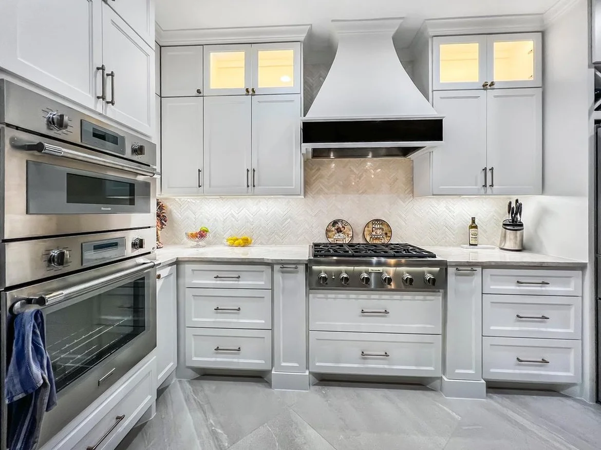 The outdated backsplash was replaced with a bright herringbone tile pattern, adding texture and elegance. Under-cabinet lighting enhances the tilework and improves visibility while preparing food.
