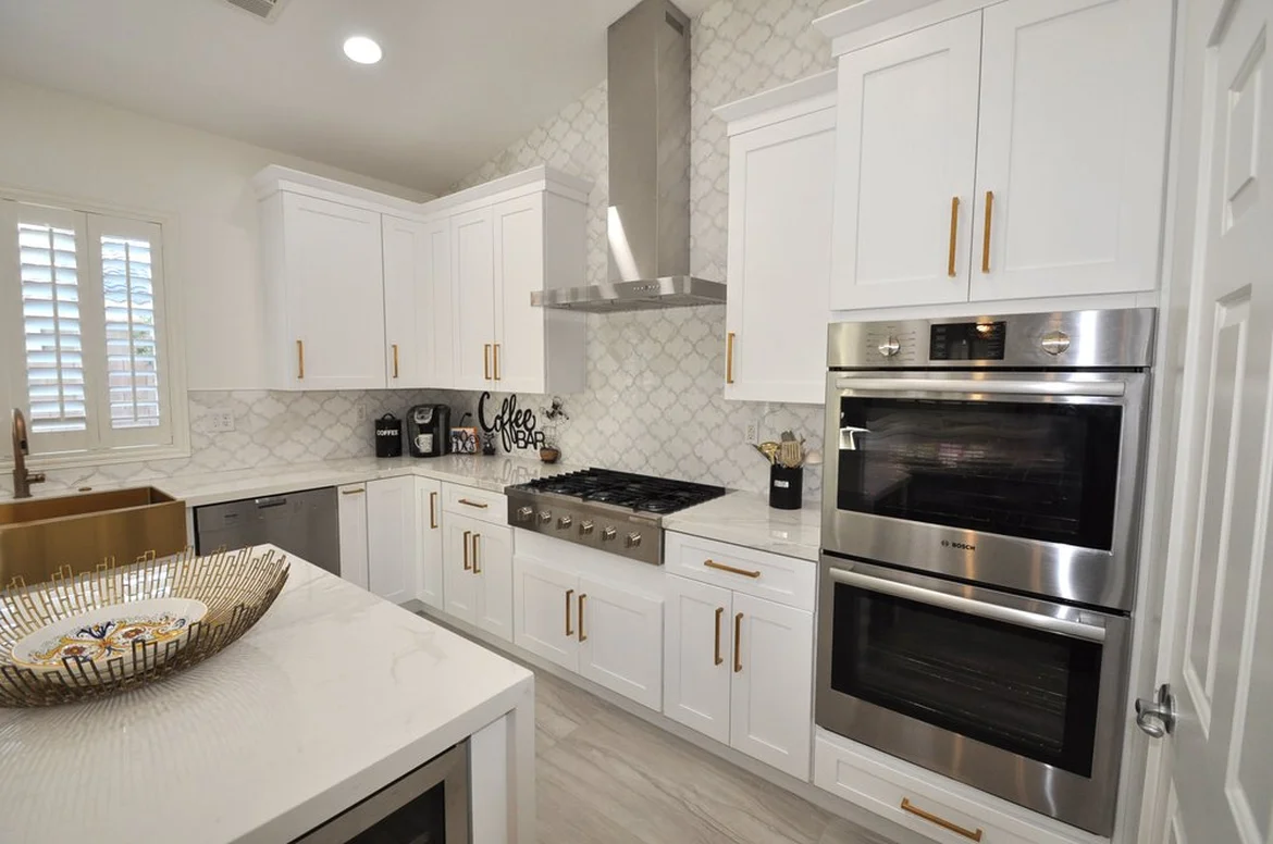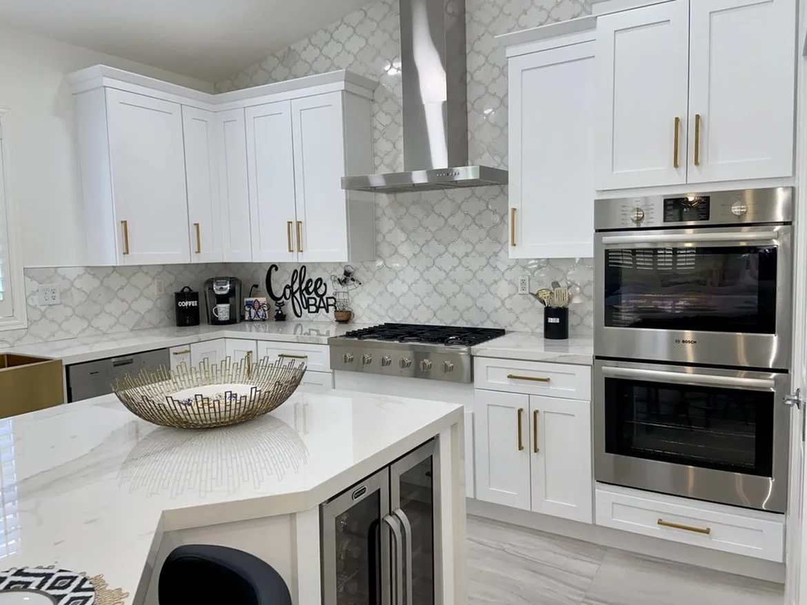 The existing cabinets, countertops, and appliances were completely removed. We installed custom white cabinetry with soft-close drawers and gold handles for an elegant, modern feel. The new layout maximizes storage and provides a clean, streamlined look.