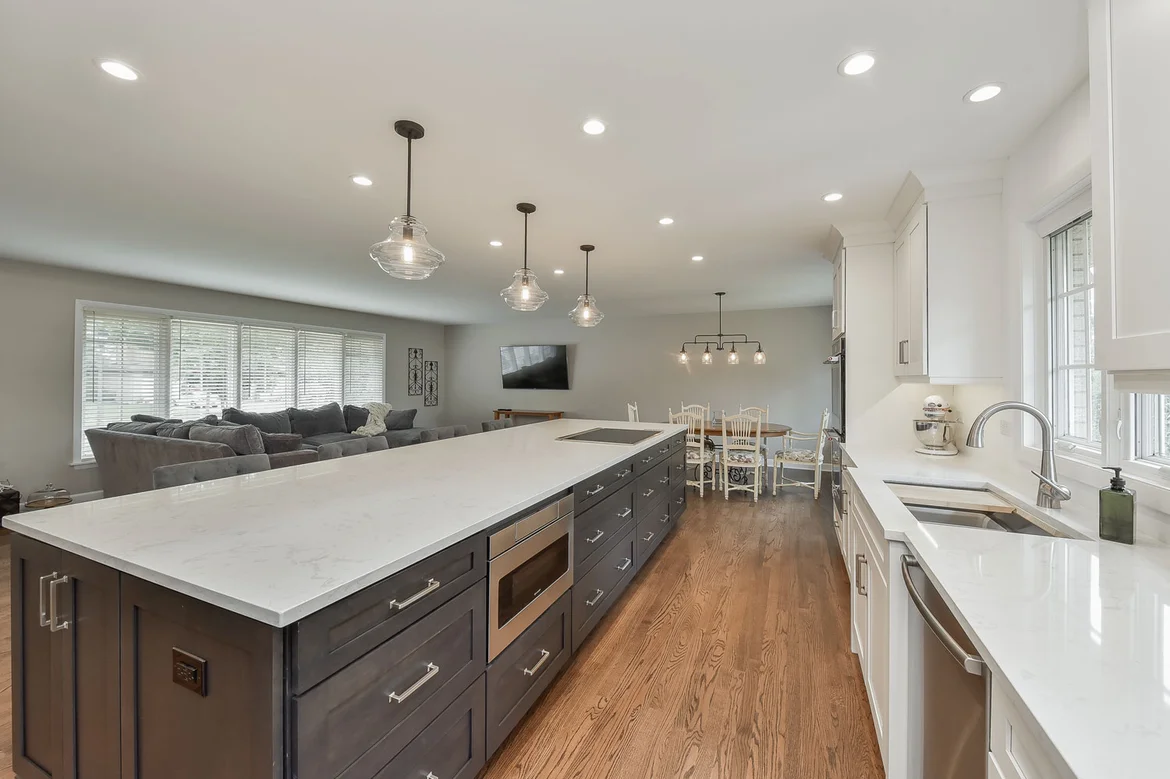 Removed dividing walls to create a seamless open-concept flow between the kitchen, dining room, and living room.