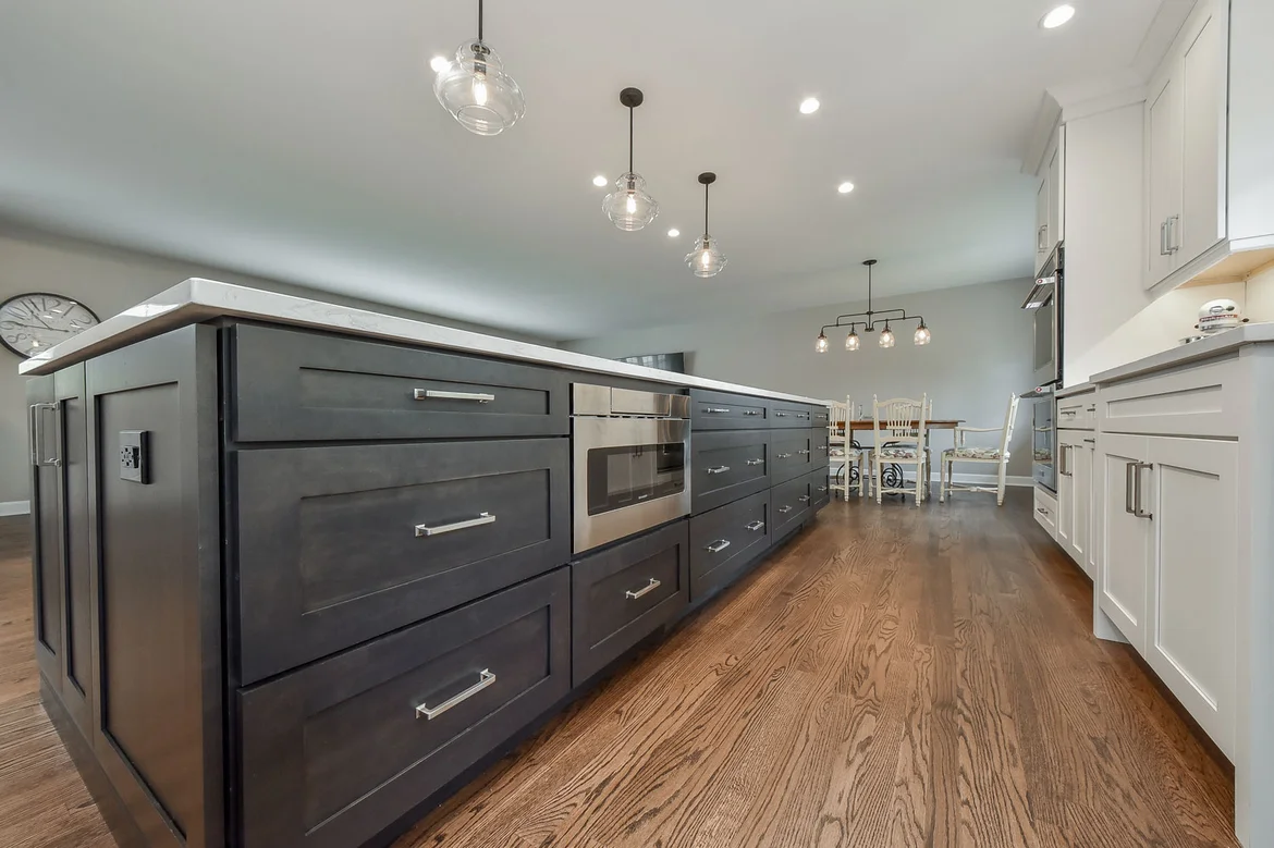 Built a massive multi-seat island with a dark espresso base and white quartz top.