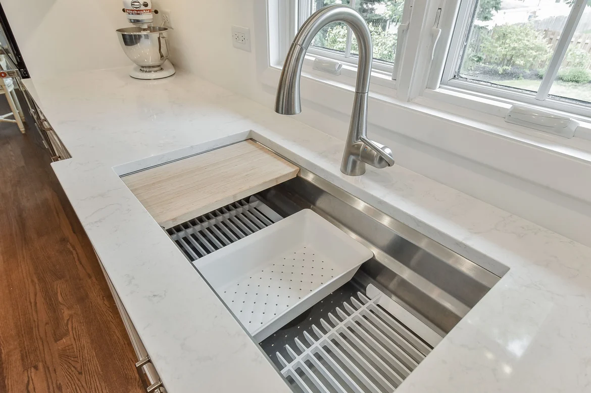 Updated the sink area with a clean, polished faucet and deep, functional basin.