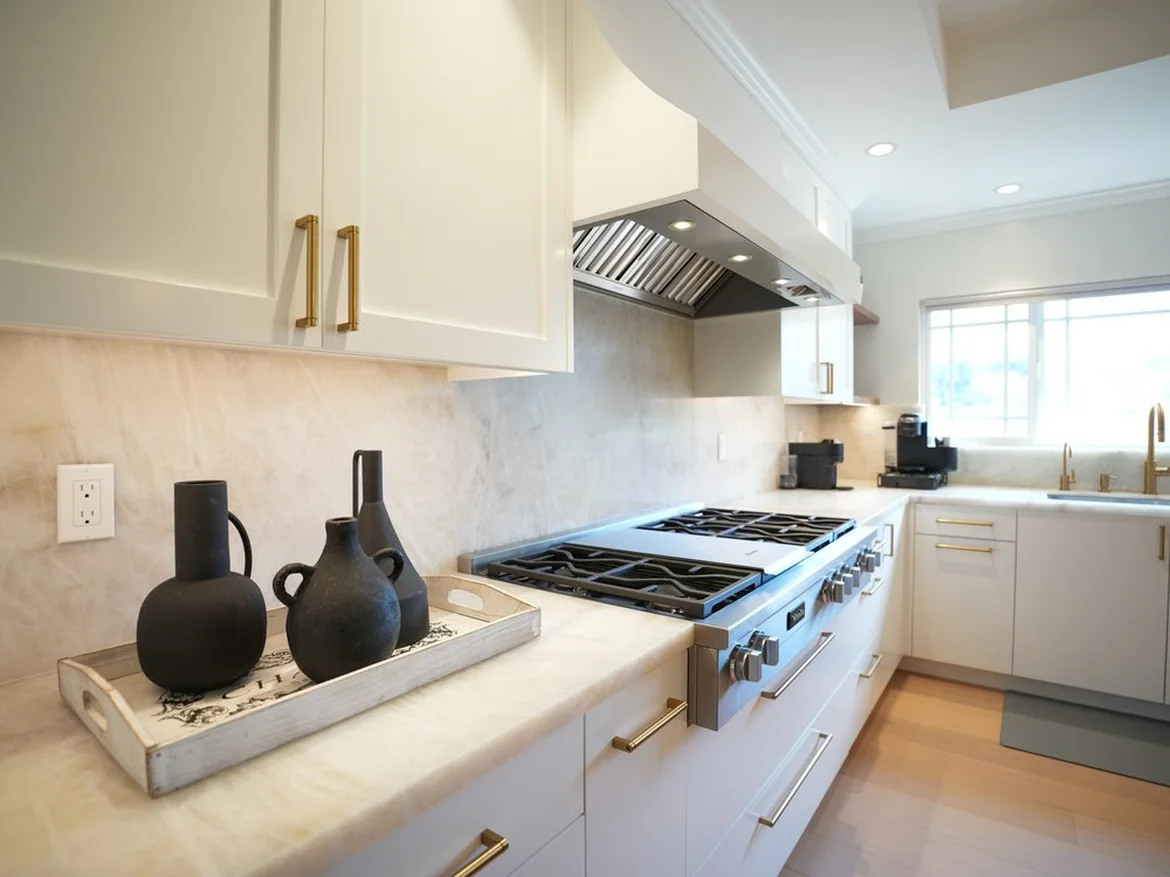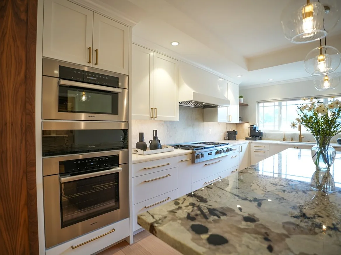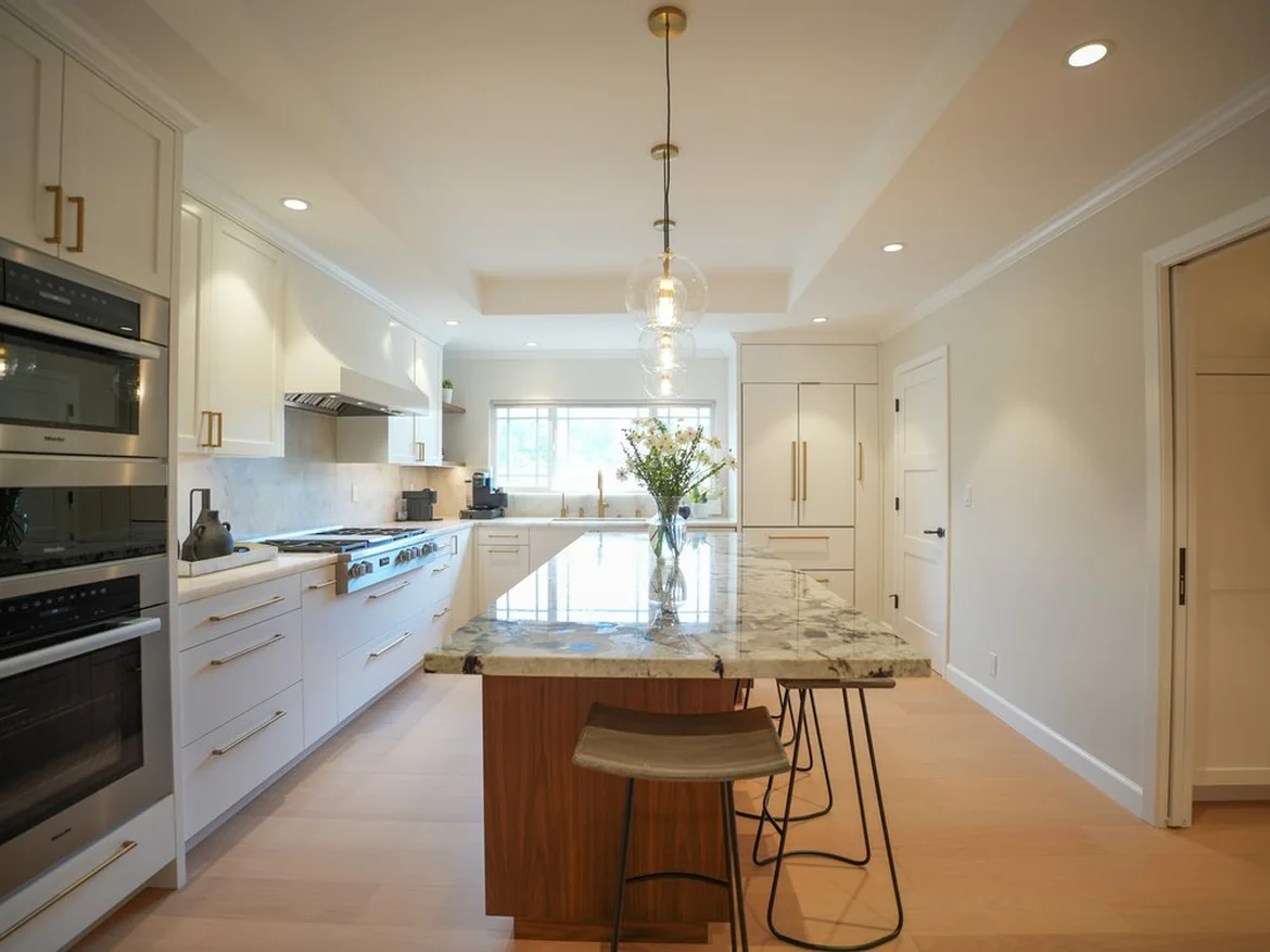 For this full kitchen renovation, our team completed a comprehensive transformation that refreshed the entire space. The remodel included updates to the ceiling structure, new lighting, fully refinished walls, new flooring, custom cabinetry, premium countertops, upgraded appliances, and a redesigned pantry for improved functionality and storage.