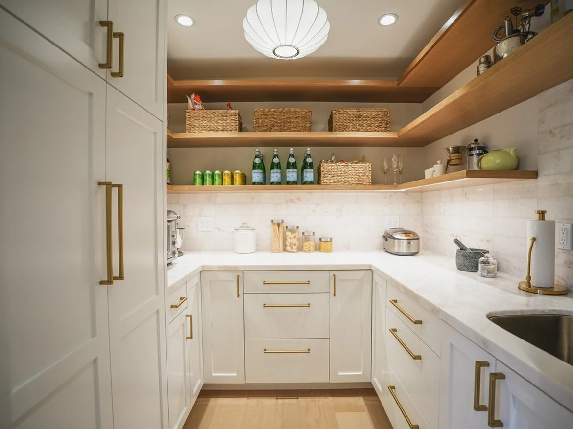 The pantry was fully redesigned with open shelving, new countertops, updated lighting, and custom cabinetry. The result is an organized, efficient space that complements the main kitchen design.