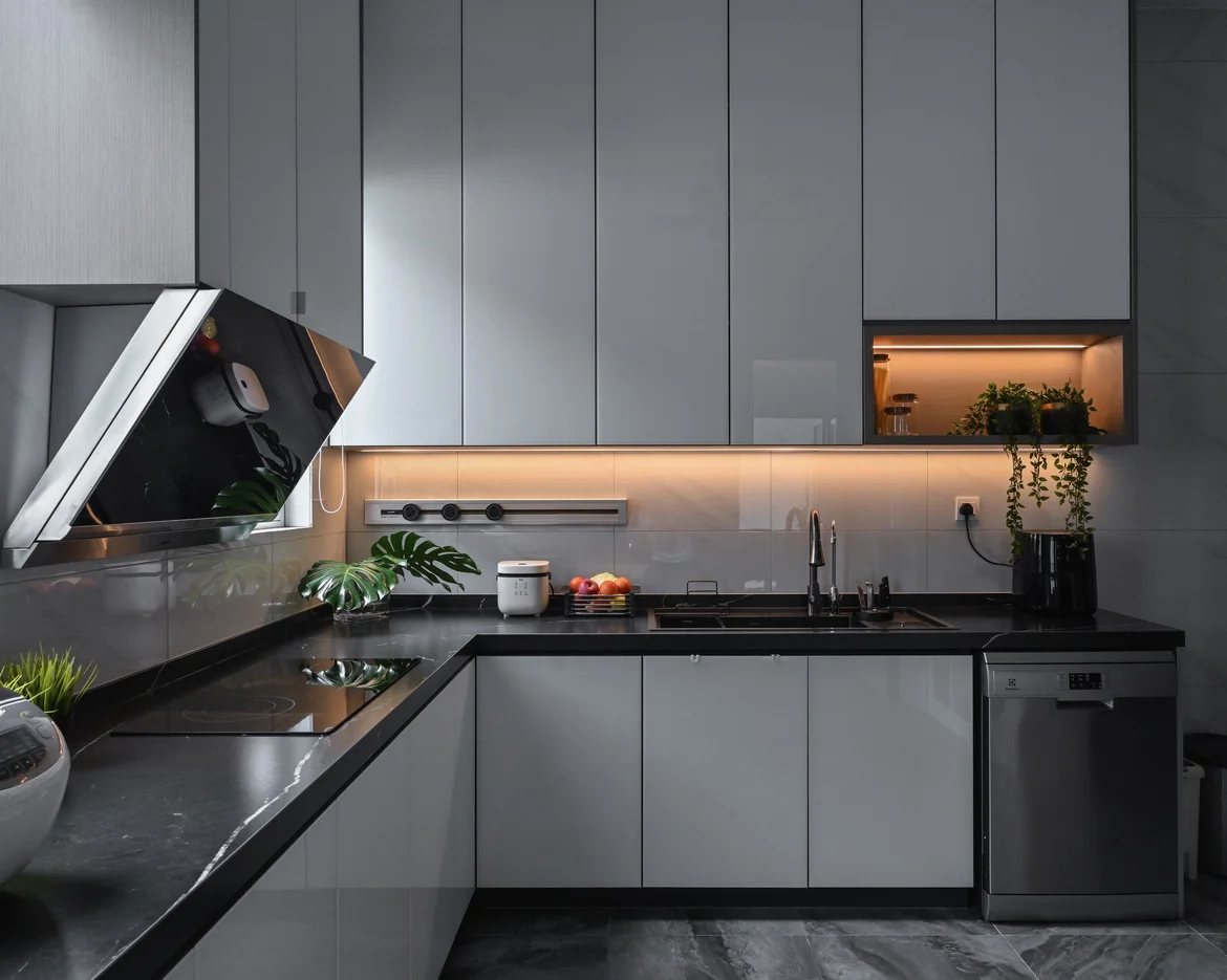 All kitchen appliances, including the cooktop, dishwasher, and ventilation hood, were fully integrated into the cabinetry. The ventilation system was properly aligned and secured for effective air circulation.