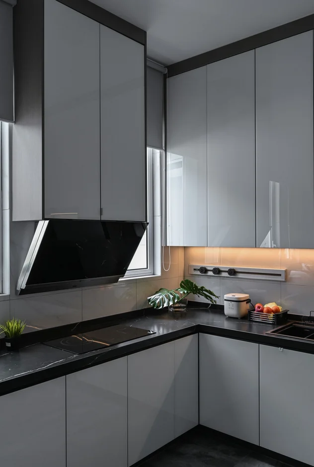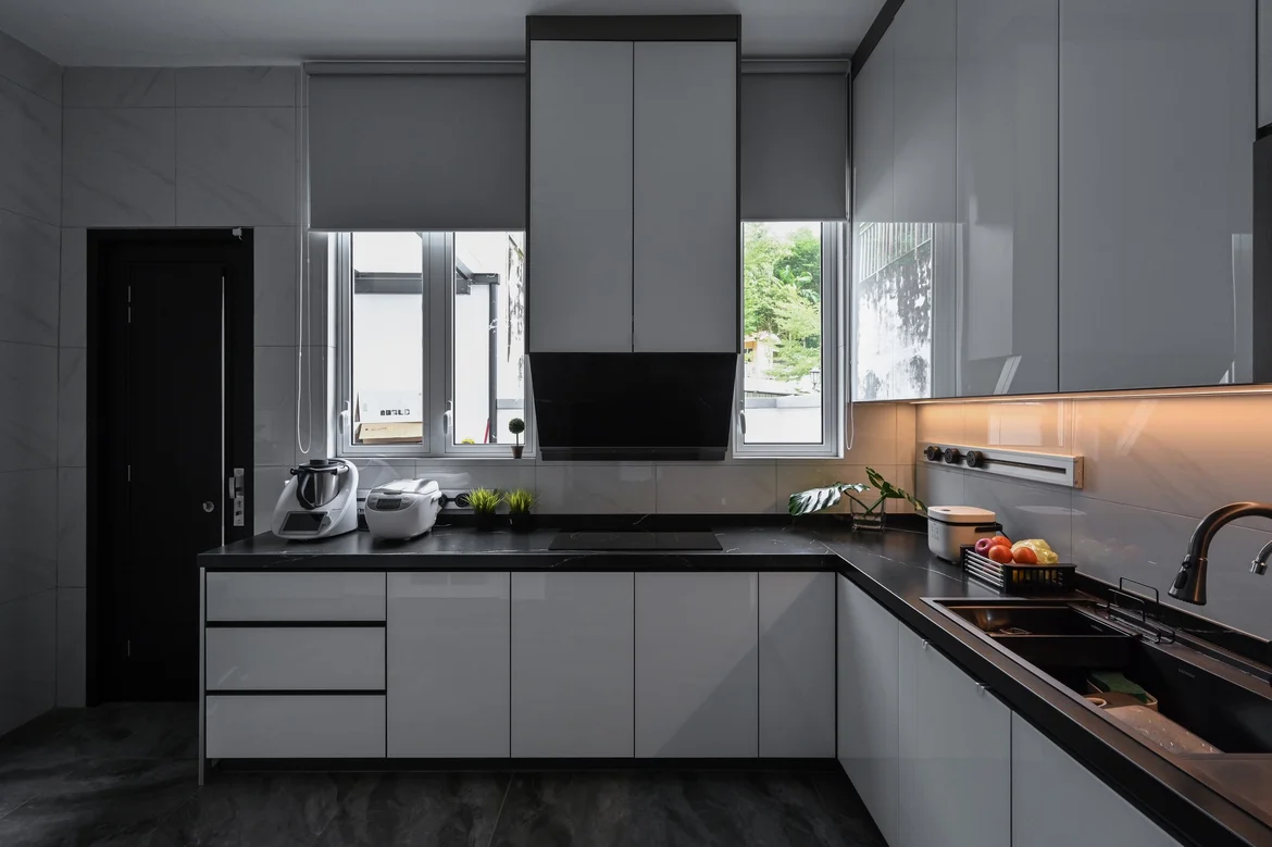 A solid black countertop was installed, offering a durable, easy-to-maintain work surface. The clean lines and contrasting finish enhance the overall modern aesthetic of the kitchen.