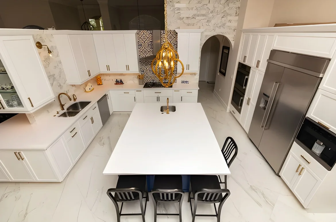 Backsplash and Finishes: A light, textural geometric backsplash (likely a honeycomb or subway pattern) was installed, adding subtle visual interest without distracting from the clean lines of the white countertops.
