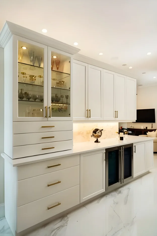 The Expansive Island: A colossal, central multi-seater island was installed. Its dark base provides an anchor for the room, contrasting sharply with the bright white countertop. This island serves three primary functions: extensive food preparation, a large serving buffet, and a casual dining bar accommodating at least eight modern stools.