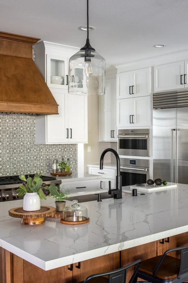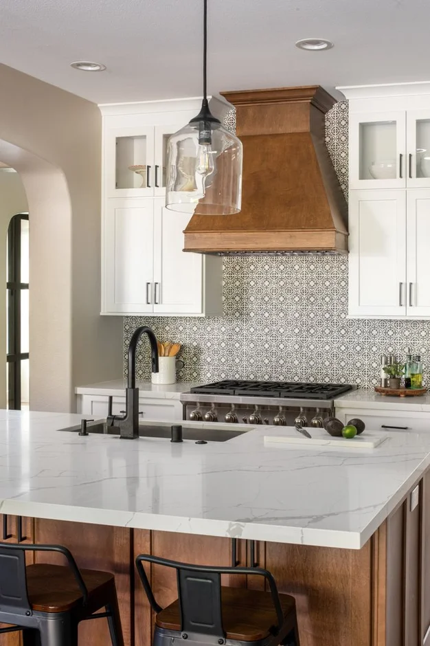 A decorative patterned tile backsplash was installed, extending from the countertop to the ceiling behind the range. This feature adds visual depth and ties together the modern and classic design elements.