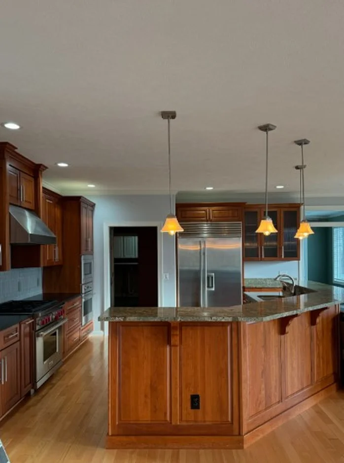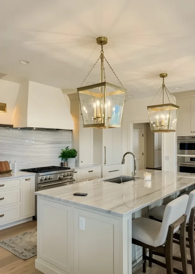 Added refined lighting — classic ceiling pendants above the island — to accentuate a modern aesthetic.
