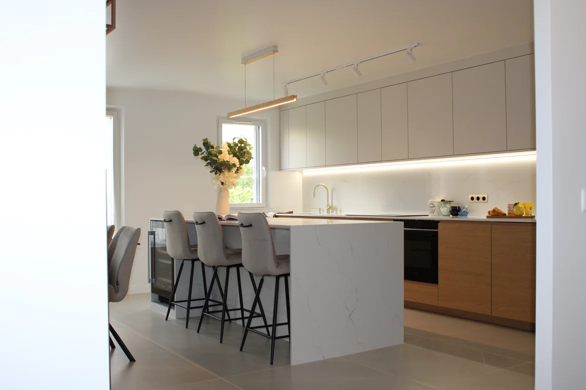This kitchen renovation delivers a clean, modern, and timeless aesthetic with a soft palette, premium materials, and thoughtfully integrated lighting. The combination of matte cabinetry, warm wood accents, and elegant marble surfaces creates a calm and inviting cooking environment.
