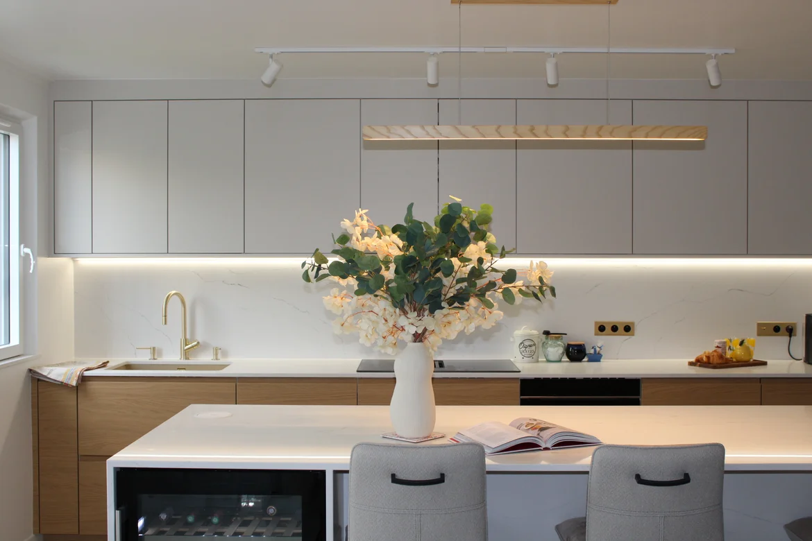 Hung a linear wooden pendant above the island, complementing the warm wood tones and enhancing the overall modern aesthetic.