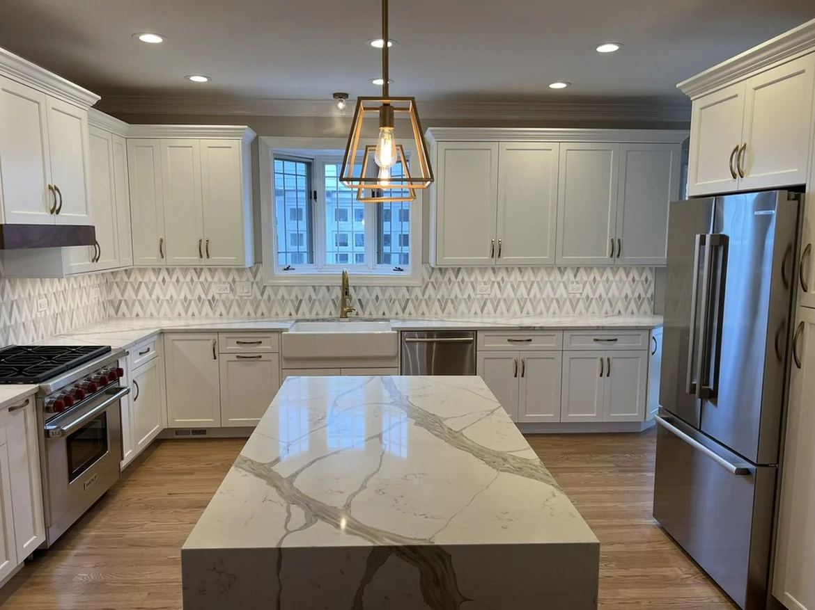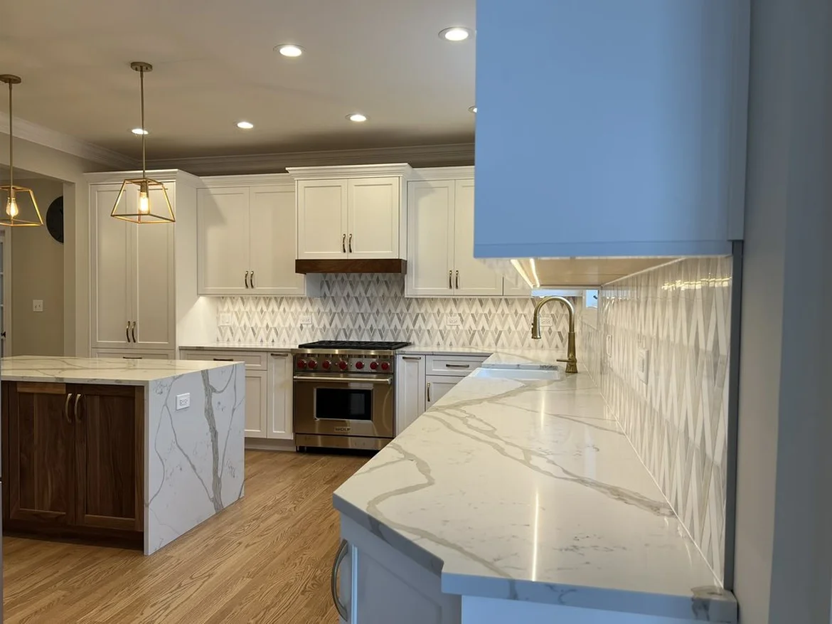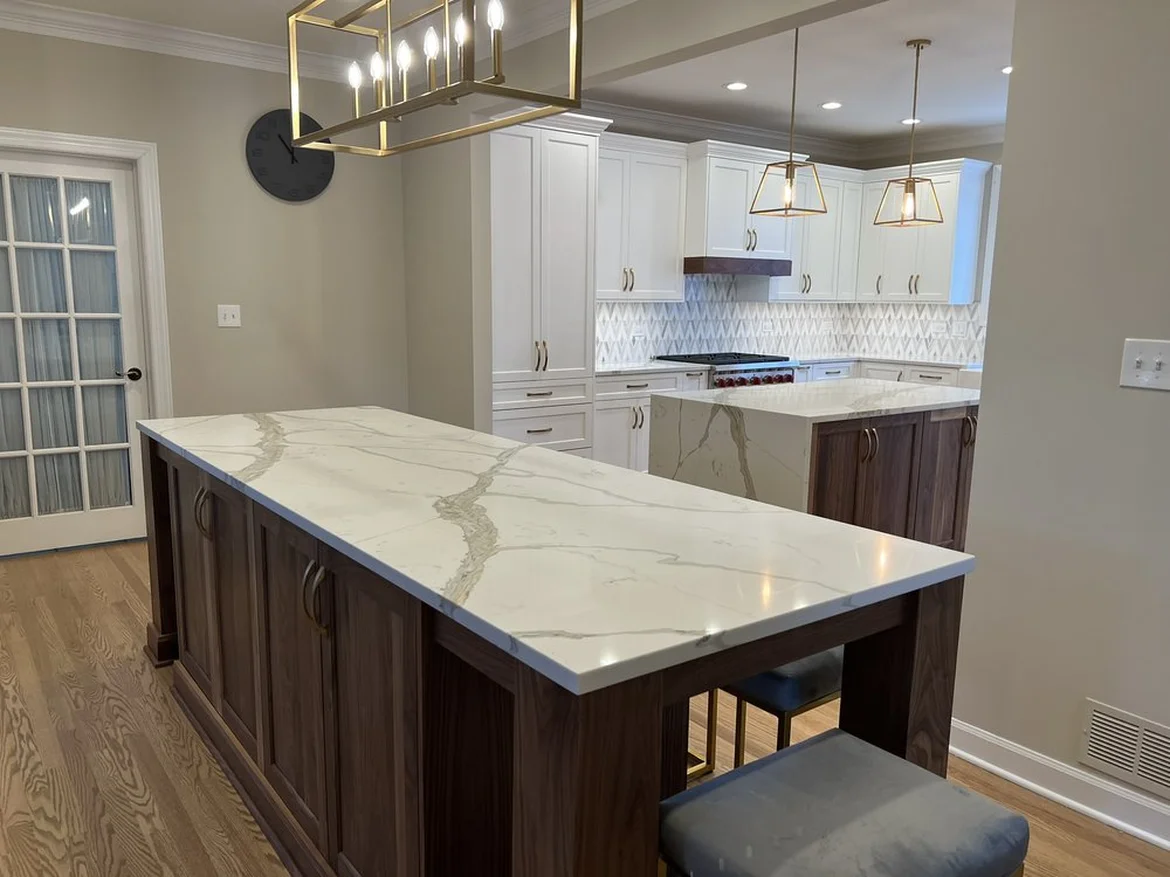 Premium marble-veined quartz countertops were added throughout the kitchen. A redesigned center island with a walnut base and waterfall quartz surface provides additional storage, workspace, and seating.