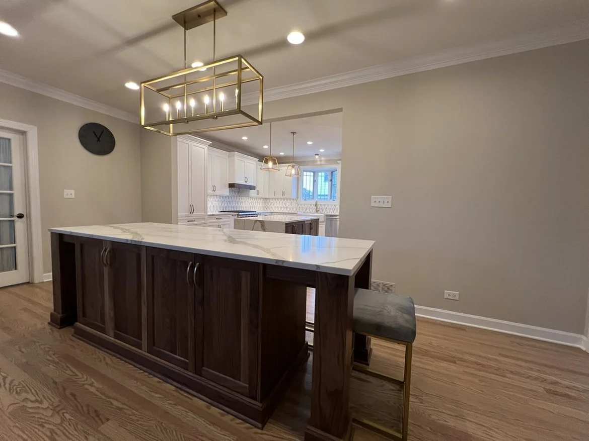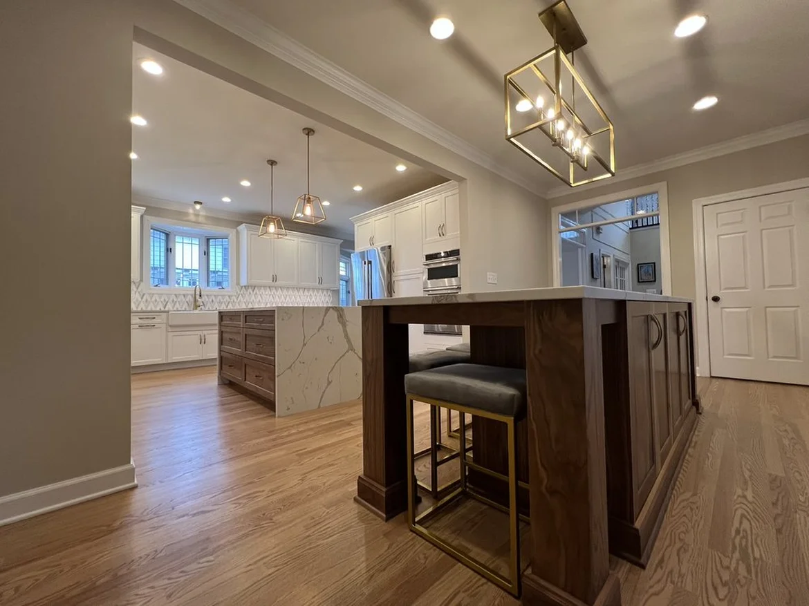 The electrical layout was redesigned, adding new outlets, switches, and circuits for modern appliances. Recessed ceiling lighting was installed throughout the kitchen, along with decorative pendant fixtures above the island and sink area. The updated lighting improves both workspace visibility and overall ambiance.