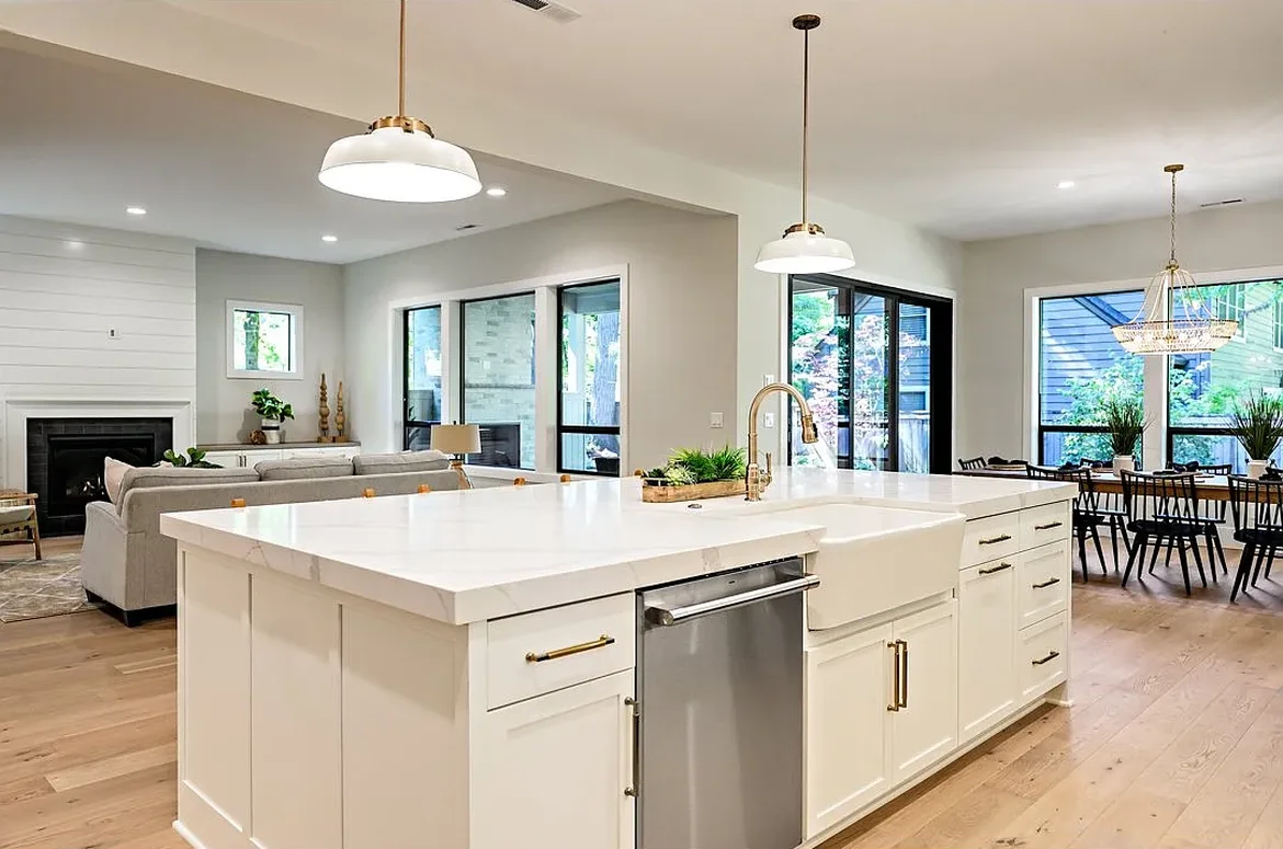 All countertops were replaced with premium white quartz, including a thick-edge slab on the expanded kitchen island. The island now offers generous preparation space, a built-in sink area, and seating for up to five, making it both functional and visually striking.